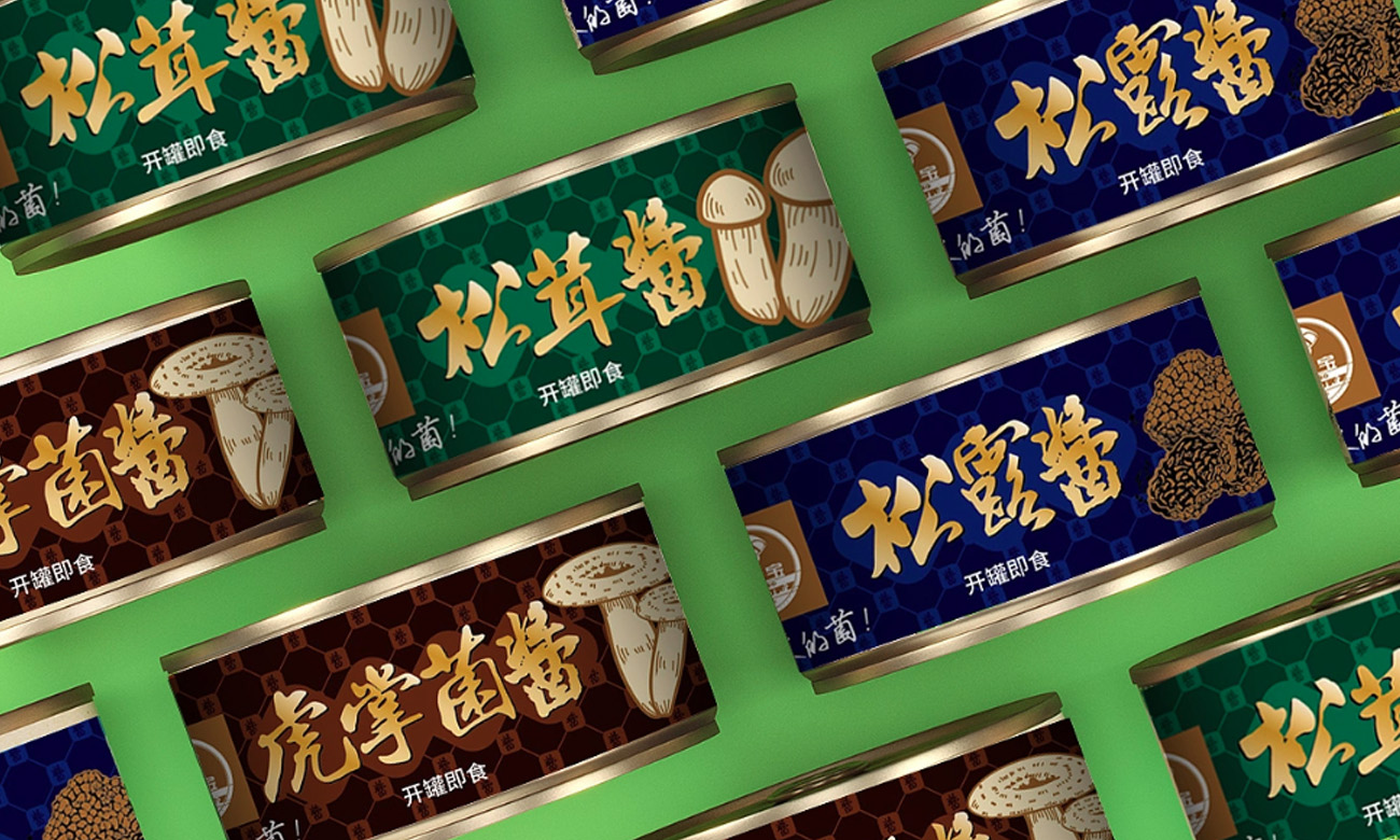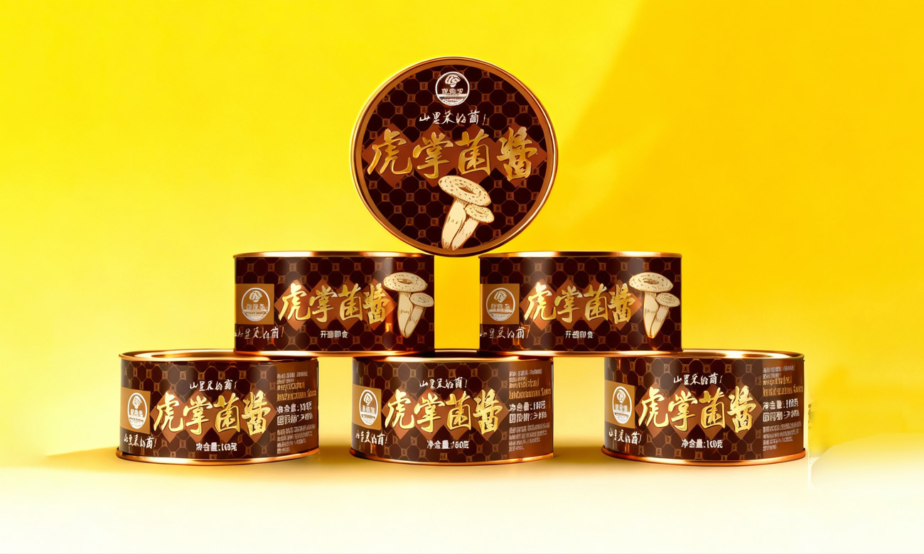 虎掌菌酱用棕金色调 + 虎掌菌图案,呼应其醇厚山野质感;