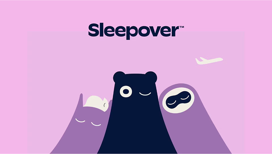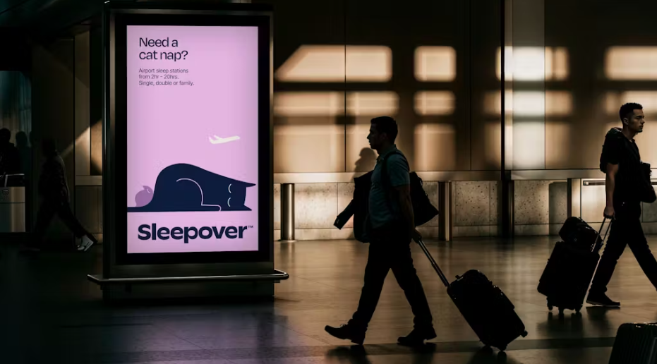 Without 为“Sleepover”创造了视觉和语言标识——一项新的机场服务,为压力重重的旅客提供小憩和放松的场所。