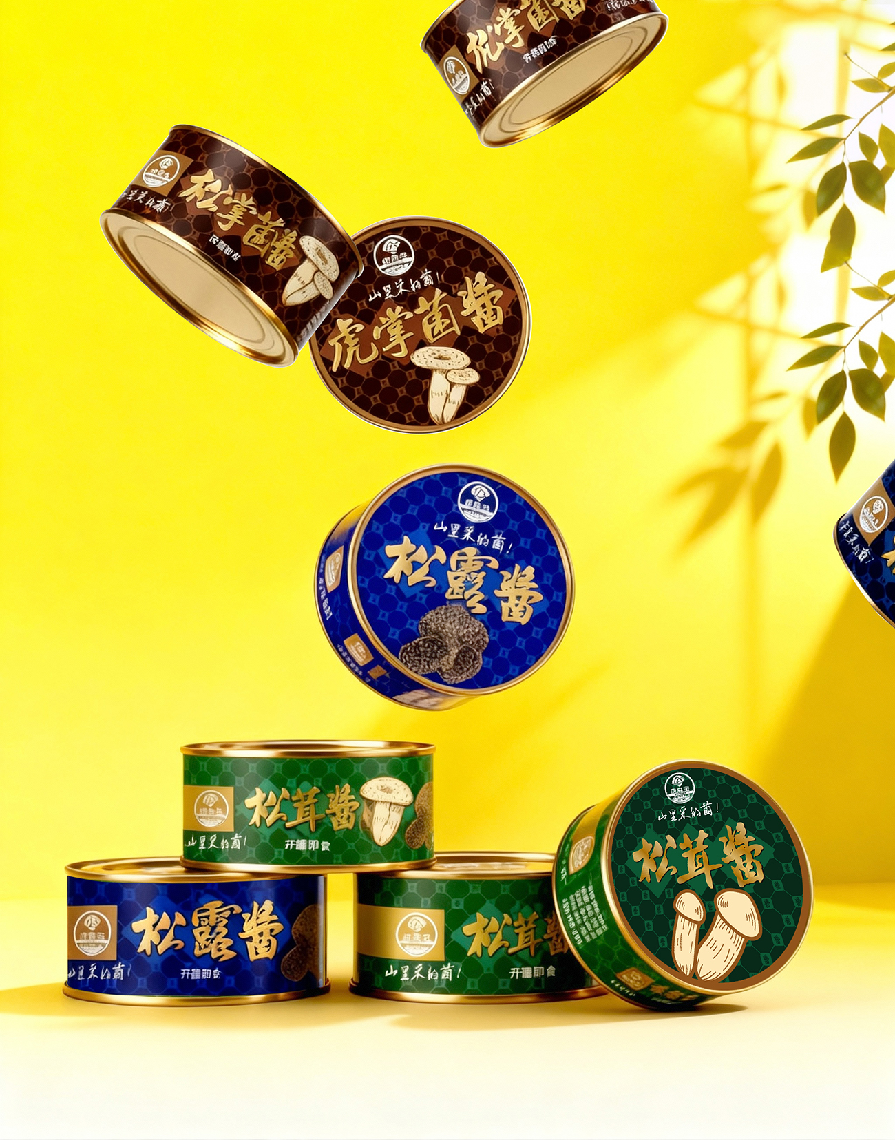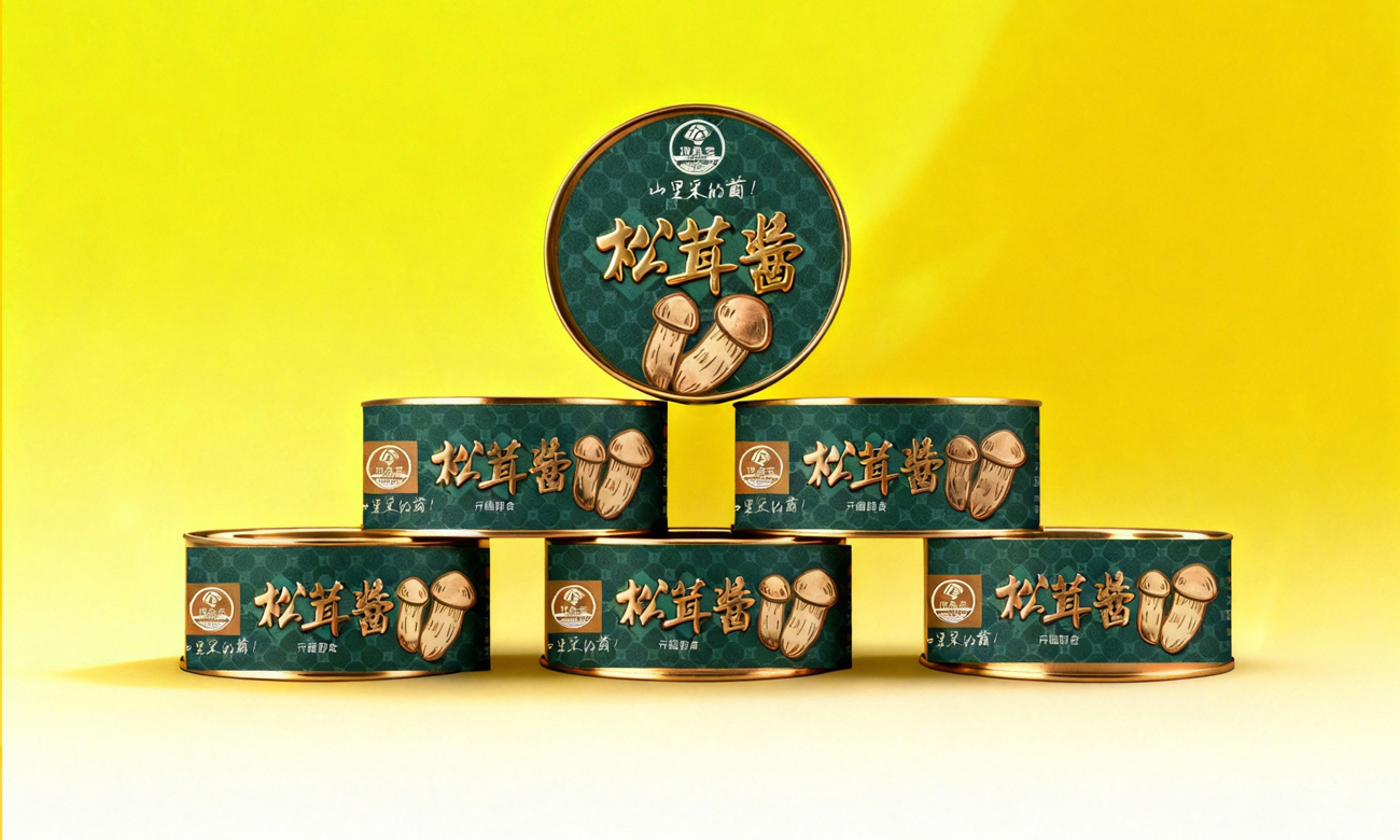 虎掌菌酱用棕金色调 + 虎掌菌图案,呼应其醇厚山野质感;